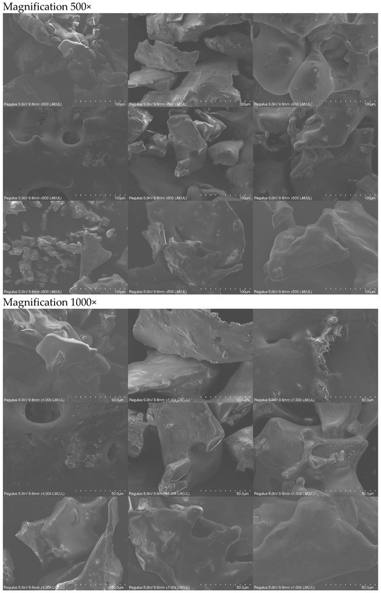 The SEM morphology observation of the digestion products, obtained from the 4 h in vitro oral–gastrointestinal digestion simulation of the S. rugosoannulata protein–peptide-based materials, showed that the digestion products had a loose, rough, porous structure and showed apparent granular morphology with uneven particle sizes and dense distribution. Internal cavities or laminar structures were observed in some particles (Figure 1).