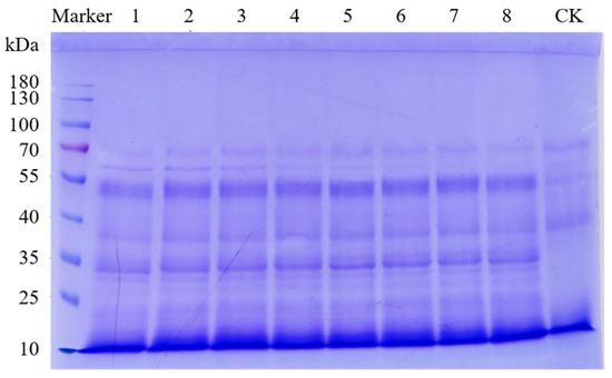 SDS-PAGE plot of base material digestion products. Note: SDS-PAGE lane information represents marker, digestion products 1 to 8, and undigested control sample (CK).