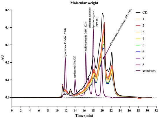 Molecular weight distribution plot of base material digestion products. Note: The legend information represents digestion products 1 to 8, undigested control sample (CK), and molecular weight-corrected standards.