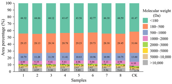 Molecular area percentage of base material digestion products. Note: The horizontal coordinate sample information represents digestion products 1 to 8 and undigested control sample (CK).