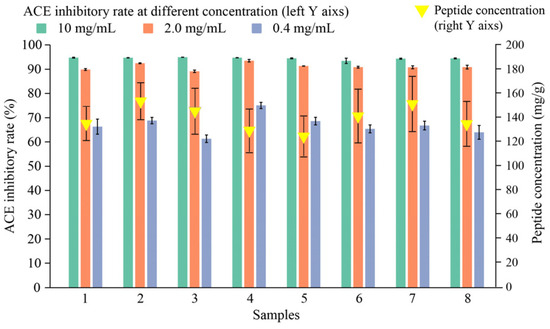 Peptide concentration and ACE inhibition rates of base material digestion products. Note: The horizontal coordinate sample information represents digestion products 1 to 8.