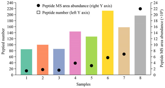 The distribution of peptide spectra in the digestion products sample group is shown in Figure 6. The results showed that the mass spectral peak areas of the peptide molecules in the products were highly variable under different levels of oral–gastrointestinal digestion. The number of peptide molecules and the peptide spectral abundance of the products dominated by gastric digestion (gastric digestion time of more than 2 h, sample groups 5–8) were generally higher than those of the products dominated by intestinal digestion (intestinal digestion time of more than 2 h, sample groups 1–3), indicating that the base materials produced more abundant peptide molecules during the gastric digestion stage. In addition, the chain length analysis of the peptide molecules showed that long-chain peptides (tetradecapeptides and above) accounted for >10% of the gastric digestion-dominated products, indicating that gastric digestion had limited degradation ability for molecules of this molecular weight. The molecular weight was reduced in the intestinal digestion-dominated products, which were transformed into short-chain peptide molecules. The number of shared peptide molecules in the digestion products obtained from different gastrointestinal digestion levels was 32 (the number of peptide molecules obtained at different digestion levels was in the hundreds), and information on the shared peptide molecules is shown in Supplementary Table S5. Hexapeptide–octapeptide molecules accounted for 66% of the common peptide molecules.