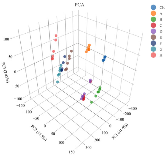Principal component analysis (PCA) was used to observe the overall distribution of each sample group, and the distribution of samples in the PCA quadrant spaces is shown in Figure 8. The results showed that the undigested base materials (CK), product samples dominated by gastric digestion (samples E–H), and product samples dominated by intestinal digestion (sample A–C) were distributed in different quadrant spaces. Therefore, the samples that had received different levels of digestion could be effectively distinguished.