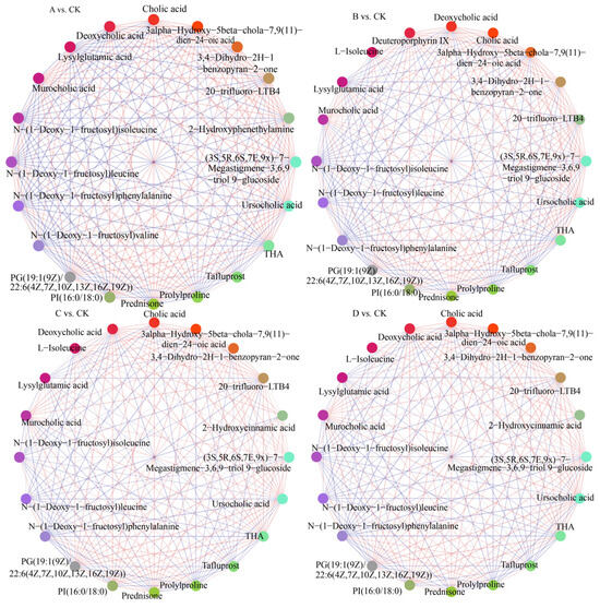 Correlation network of top 20 DEMs between groups and CK sample comparison groups.