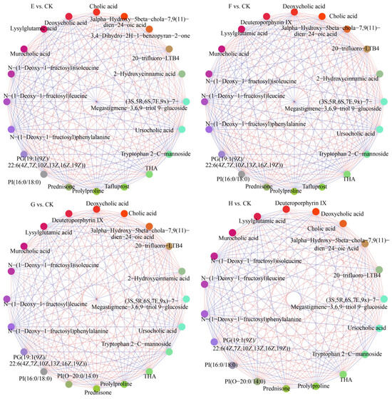 An S-plot loading plot of the OPLS Da model was used to characterize the distribution of metabolites among the sample comparison groups and the intensity of the metabolites’ effects on the comparison groups. The metabolite distribution S-plot loading plot of the sample comparison groups is shown in Supplementary Figure S4. The horizontal coordinates of the S-plot loading plot were the eigenvalues of the metabolite effects on the sample comparison groups. The vertical coordinates were the correlations between the sample scores and the metabolites. The differences in the metabolites near the upper-right and lower-left corners of the S-plot loading plot were significant. The results showed that the primary difference metabolites were consistent for groups B–H vs. CK. At the same time, the compound types were slightly different between the other sample comparison groups (groups vs. A, groups vs. B, groups vs. C, groups vs. D, groups vs. E, and groups vs. F), except for cholic acid (in the S-plot loading plot, metabolite number: 8.80_408.2878n), N-(1-deoxy-1-fructosyl) isoleucine (1.32_293.1477n), N-(1-deoxy-1-fructosyl) leucine (0.82_293.1477n), N-(1-deoxy-1-fructosyl) phenylalanine (2.14_327.1321n), and N-(1-deoxy-1-fructosyl) valine (0.78_279.1321n). Other glycosylated amino acids were the main compounds that caused the differences between the comparison groups (Supplementary Table S7).