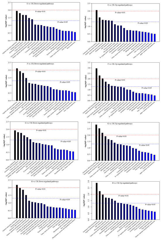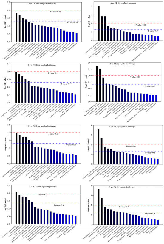 Orthogonal partial least squares discriminant analysis (OPLS-DA) was used to compare the differences in metabolic profiles between the sample groups, and the OPLS Da score plots are shown in Supplementary Figure S2. The results showed that the sample comparison groups were significantly different within 95% confidence intervals (in the case of groups vs. CK). The OPLS Da model parameters are shown in Supplementary Table S6.