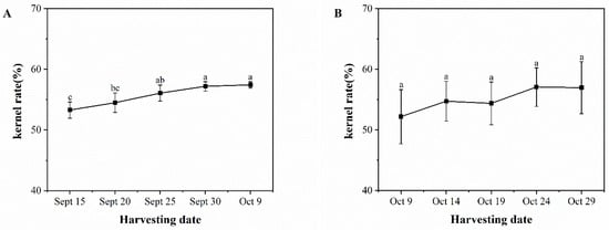 Changes in kernel rates of ‘Pawnee’ (A) and ‘Wichita’ (B) at different harvesting periods. Means followed by the same letter do not significantly differ at p < 0.05.