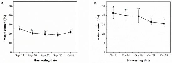 Changes in water content of ‘Pawnee’ (A) and ‘Wichita’ (B) at different harvesting periods. Means followed by the same letter do not significantly differ at p < 0.05.
