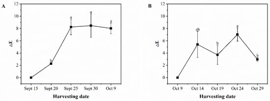 Changes in ∆E (total color difference) of ‘Pawnee’ (A) and ‘Wichita’ (B) at different harvesting periods. Means followed by the same letter do not significantly differ at p < 0.05.