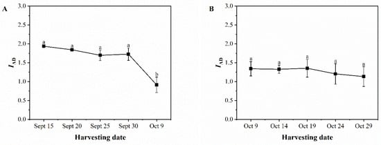 Changes in IAD (the difference in absorbance at 670 nm and 720 nm) of ‘Pawnee’ (A) and ‘Wichita’ (B) at different harvesting periods. Means followed by the same letter do not significantly differ at p < 0.05.