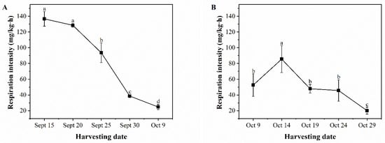 Changes in respiratory intensity of ‘Pawnee’ (A) and ‘Wichita’ (B) at different harvesting periods. Means followed by the same letter do not significantly differ at p < 0.05.