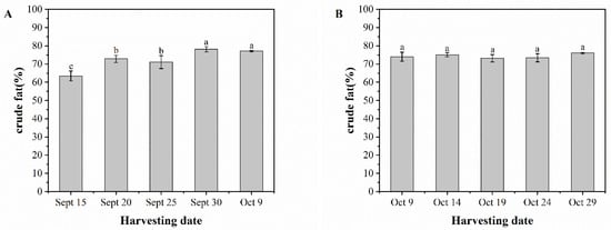 Crude fat content of ‘Pawnee’ (A) and ‘Wichita’ (B) at different harvesting periods. Means followed by the same letter do not significantly differ at p < 0.05.
