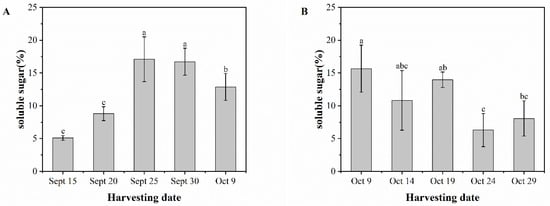 Soluble sugar content of ‘Pawnee’ (A) and ‘Wichita’ (B) at different harvesting periods. Means followed by the same letter do not significantly differ at p < 0.05.