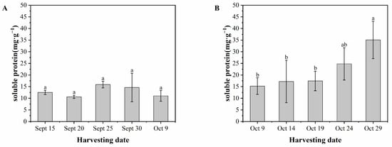 Figure 8A indicates that there was no significant difference in the soluble protein content of ‘Pawnee’ fruits during the harvest period. The mean values of soluble protein content for the five harvest dates from September 15 to October 9 were 12.53 mg·g−1, 10.62 mg·g−1, 15.89 mg·g−1, 14.62 mg·g−1, and 11.01 mg·g−1, respectively. Figure 8B shows that the soluble protein content of ‘Wichita’ fruits increased over time. The content remained stable from October 9 to October 19 and then significantly increased from October 19 to October 29. The lowest soluble protein content was 15.23 mg·g−1 on October 9, while the highest was 35.08 mg·g−1 on October 29. Overall, ‘Wichita’ fruits had higher soluble protein content than ‘Pawnee’ fruits.