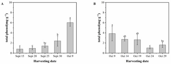 Total phenol content of ‘Pawnee’ (A) and ‘Wichita’ (B) at different harvesting periods. Means followed by the same letter do not significantly differ at p < 0.05.
