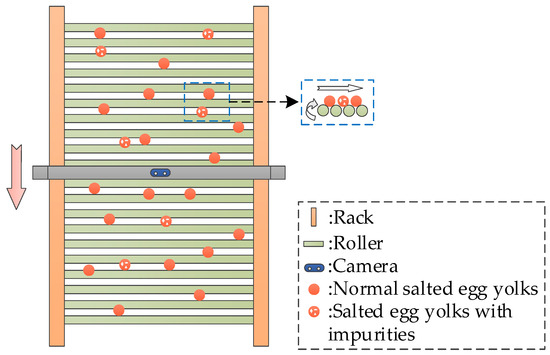 As shown in Figure 1 and Figure 2, normal salted egg yolks and those with impurities were distributed on the conveyor belt in distinct density patterns. There was no noticeable stacking or obscuring. Salted egg yolks with impurities characterized by visible white eggshell residues displayed clear differences in color and texture compared to normal salted egg yolks. These differences provide a basis for the precise and rapid identification of salted egg yolks with impurities.