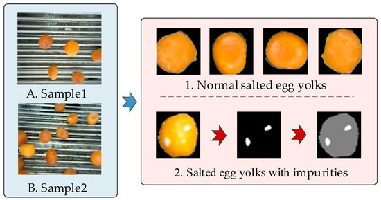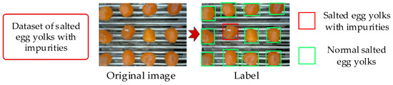 This study focused on a binary classification problem, distinguishing between salted egg yolks with and without white eggshell residues on their surfaces. Owing to the high oil content in salted egg yolks, uneven surfaces can reflect light, creating white spots that may interfere with accurate identification. To differentiate between these white spots and small white eggshell residues, experienced production staff assessed the presence of impurities from video frames, which were standardized to 640 × 640 pixels. The SAM image annotation tool was employed to construct a detection dataset for salted egg yolks with impurities, formatted according to COCO dataset standards. Normal salted egg yolks and those with impurities were labeled as “egg yolk product” and “defective product,” respectively. The dataset maintained an approximate 7:3 ratio between these two categories. The dataset composition and construction process are depicted in Figure 3 and Table 1.