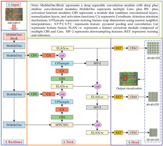 The Input section preprocesses salted egg yolk images with a resolution of 640 × 640 × 3 using Mosaic data augmentation, adaptive anchor box calculation, and adaptive grayscale filling before these images are passed to the Backbone. The Backbone, consisting of MobileOne-Blocks and MobileOne, performs progressive feature extraction across different scale feature maps. These maps are then adjusted and input into the feature fusion network. The Neck employs a PAFPN structure, incorporating CBS, MP-2, CA, and Spatial Pyramid Pooling with Channel Spatial Pyramid Compression (SPPCSPC). CBS extracts features, MP-2 merges features from various scales, CA enhances the network’s focus on critical features of salted egg yolks with impurities, and SPPCSPC broadens the receptive field for multi-scale feature integration. The enriched feature information is subsequently processed by the prediction network, which uses reparameterizable convolution modules to adjust channels and perform upsampling fusion across three feature layers. Instead of CIoU, Focal-EIoU is used for category prediction and bounding box anchoring specific to salted egg yolks with impurities. The final output consists of feature maps with dimensions of 20 × 20 × 255, 40 × 40 × 255, and 80 × 80 × 255, facilitating the recognition and localization of salted egg yolks with impurities.