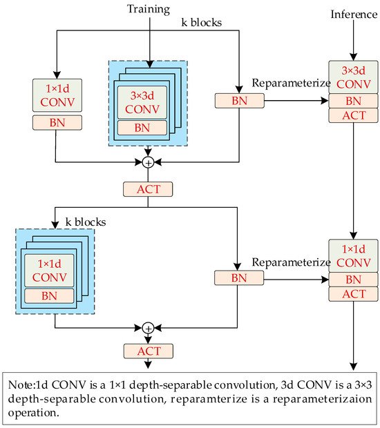 As illustrated in Figure 5, during training, the MobileOne-Block extracts extensive feature information from salted egg yolk images. In the inference phase, the multi-branch structure is reparameterized into a single-branch configuration, reducing the model parameter count and improving inference speed.