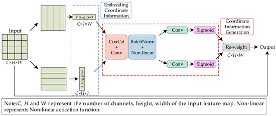 As depicted in Figure 6, the input feature map of size C × H × W was subjected to global average pooling along both height and width dimensions to generate feature maps for horizontal and vertical directions, incorporating coordinate information. This was followed by concatenation, convolution, batch normalization, and non-linear activation. Convolution and sigmoid operations were then applied separately to the height and width channels to compute directional weights, which were used to generate the coordinate information. Finally, these weights were applied to the original feature map to produce an attention-calculated weighted feature map. The input feature map of dimensions C × H × W was aggregated along the horizontal and vertical coordinates via global average pooling. The outputs for channel at height and width can be represented using Equations (1) and (2), respectively.