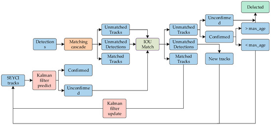 Building upon the YOLOv7-SEY framework for detecting salted egg yolks with impurities, this study integrated DeepSORT [27] for multi-object tracking. DeepSORT, an enhancement of the SORT algorithm [28], incorporates cascade matching and state confirmation, utilizing both Mahalanobis and cosine distance metrics. This integration significantly improves tracking performance, particularly under occlusion [29,30].