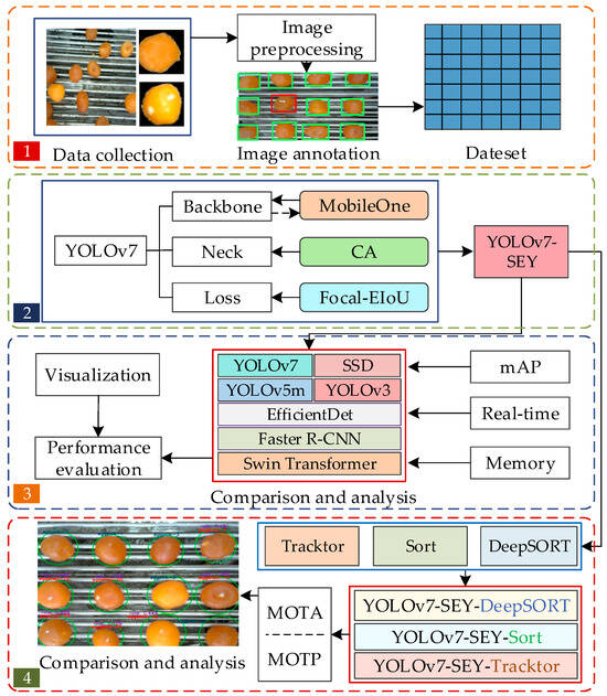 The experiments on salted egg yolk detection and tracking, based on an improved YOLOv7 integrated with DeepSORT, involved the following steps: