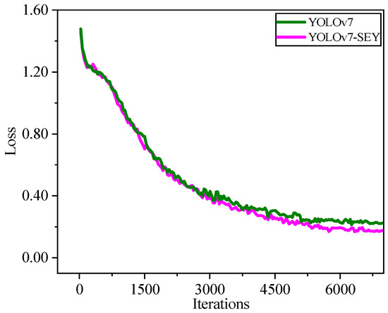 Trend in loss values with iterations during training of YOLOv7 and YOLOv7-SEY.