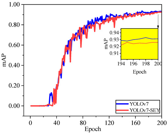 Trend in mAP values with epochs during training of YOLOv7 and YOLOv7-SEY.