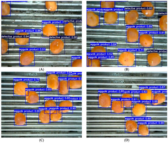 Figure 11 indicates significant variations in the distribution density of salted egg yolks among the four classes (A–D) of image samples. Specifically, samples B and C exhibited higher density compared to samples A and D, with samples C and D consisting exclusively of normal salted egg yolks without impurities. The proposed model demonstrated high confidence in accurately distinguishing between salted egg yolks with impurities and normal salted egg yolks. When salted egg yolks were adhered together, the model effectively delineated the boundaries of detection boxes without omissions or false detections. Thus, the model successfully addresses challenges such as density variations, uneven class distribution, and sticky sample conditions, demonstrating robust detection capabilities.