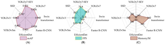 Comparison test results. (A) Comparison results of mAP values. (B) Comparison results of FPS values. (C) Comparison results of optimal model memory.