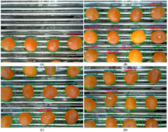 The proposed method, integrating YOLOv7-SEY for detection with DeepSORT for tracking, was evaluated using datasets of salted egg yolks. Three random segments from online production videos containing these yolks were selected to create a tracking dataset and assess the method’s effectiveness. Tracking results for frames 2, 24, 191, and 247 are illustrated in Figure 14.