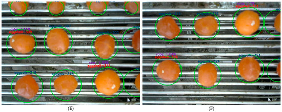 Tracking results of salted egg yolks with impurities based on YOLOv7-SEY combined with DeepSORT. (A) Frame 2. (B) Frame 24. (C) Frame 191. (D) Frame 247. (E) Frame 447. (F) Frame 495.