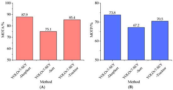 The performance of the YOLOv7-SEY and DeepSORT-based tracking methods was compared with alternatives, including Sort and Tracktor [39]. The evaluation focused on the MOTA and MOTP metrics. During the comparative experiments, frame rates and video durations were kept consistent. The results comparing YOLOv7-SEY-DeepSORT, YOLOv7-SEY-SORT, and YOLOv7-SEY-Tracktor on these metrics are presented in Figure 15.
