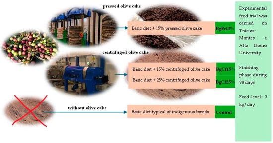 The Bísara animals were reared under the supervision of the University of Trás-os-Montes and Alto Douro in Vila Real, Portugal. A total of 48 animals were used for this study. The animals were separated into distinct groups to receive different diets (Figure 1). The control group was given a traditional diet for this indigenous breed, consisting of local vegetables, cereals, and feed appropriate for each growth stage. The other diets also had the same Base diet as the control diet, plus the type of olive cake with 15 and 25 percent (see Table 1). The animals were fed these diets during the finishing phase (90 days) and with an average feed of 3 kg daily. The University of Trás-os-Montes e Alto Douro team monitored the animals to ensure the diets were administered correctly throughout the finalization process.