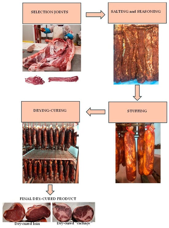 The curing process was carried out at Bísaro-Salsicharia Tradicional, Lda®, using forty-eight loins and forty-eight “cachaços” from forty-eight slaughtered animals (Figure 2). The ingredients were added in decreasing order: 1.5% salt, 0.5% paprika, 0.5% garlic, and 0.1% oregano. Both the loins and “cachaços” were dry-cured for 60 days. After removing the muscles from the carcasses, the pieces were chilled in a chamber at 2–5 °C, and excess surface fat was removed from each piece. Selected pieces then underwent the curing process. In the salting and seasoning phase, the pieces were placed on a rotating drum for approximately 30 min after adding salt, paprika, garlic, and oregano. After mixing, the joints were transferred to a container and placed in a refrigeration chamber at a temperature range of 2–4 °C with approximately 90% relative humidity for 4 days to allow the ingredients to penetrate. Next, the pieces were stuffed into collagen casings. The final phase was drying and curing, during which significant biochemical changes occurred. The temperature and humidity were adjusted as the curing progressed: for the first 15 days, the cuts were kept at 4–8 °C with 80–90% relative humidity. Subsequently, the temperature was raised to 8–12 °C with 70–80% relative humidity for another 15 days. Finally, for the last 20 days, the product was maintained at 12–18 °C with 60–70% relative humidity. This curing process has been validated by the company Bísaro-Salsicharia Tradicional Lda®, considering all the quality and food safety standards. It should be noted that the company responsible for the entire manufacturing flowchart for this type of product has been certified for over seven years by extremely demanding quality benchmarks (IFS-Food).