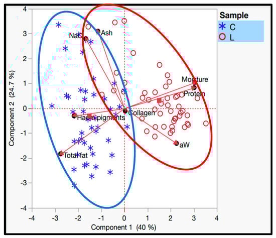 Principal component analysis (PCA) is a statistical technique used to simplify a dataset by transforming the original variables into a smaller set of new variables, called principal components, which capture the essential characteristics of the data. These principal components are linear combinations of the original variables that maximize the total variance. The primary graphical output of PCA is often a biplot, which maps the cases using the principal components and includes the original variables to help interpret the distances between case positions []. Figure 3 displays the results of the principal component analysis in the form of a biplot. The first principal component (p < 0.001) explained 40% of the total variance, and the second principal component (p < 0.001) explained 24.7% of the total variance. The two principal components explained the total variance of 64.7%. This principal component analysis shows a separation between the dry-cured loin and the dry-cured “cachaço”. The physicochemical characteristics that best explain the dry-cured loin are salt content, total fat, and haem pigments. On the other hand, water activity, protein content, and moisture are the factors that best explain the dry-cured loin. That said, the principal component analysis shows that although the two products (dry-cured loin and dry-cured “cachaço”) come from the same muscle (Longissimus thoracis Lumborum), their chemical composition is very different.