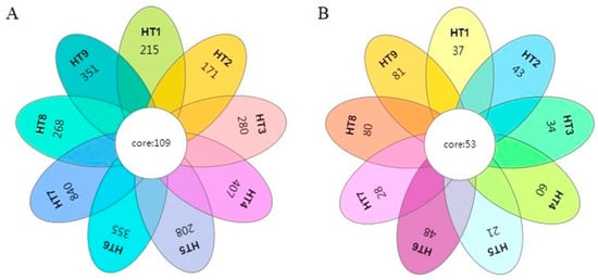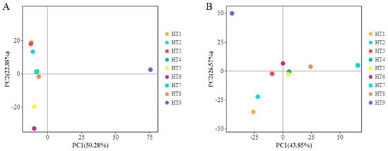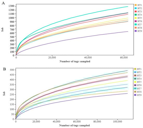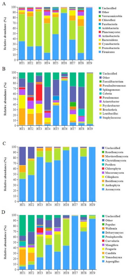 The dilution curve can evaluate whether the sequencing quantity was sufficient and indirectly reflect the richness of microbial species in the sample. When the dilution curve flattens out or reaches a plateau, it can be considered that the increase in sequencing depth does not affect the species diversity, indicating that the sequencing quantity was sufficient. At the same time, the difference of α-diversity structure between the different samples could be reflected by a comparison of the height of the curves between early and late reaching of a plateau. From the x-axis of Figure 1, it can be observed that the dilution curves for bacteria and fungi at various stages have leveled off, indicating that the sequencing depth in this experiment is sufficient. In Figure 1A, the height of the curves shows that bacterial diversity is highest at the HT7 stage and lowest at the HT9 stage. In Figure 1B, it is evident that fungal diversity is highest at the HT4 stage and lowest at the HT9 stage.