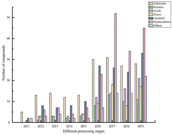 The total absolute content of all volatile flavor compounds in Mianning ham during different processing stages is 87,872.22 μg/kg. Aldehydes have the highest total absolute content, reaching 48,547.65 μg/kg. As seen in Table 3, the absolute content of aldehydes gradually increases from the HT1 to HT4 stages, peaking at 10,527.94 μg/kg during the HT4 stage, indicating that the washing and drying process during this period may lead to fat oxidation, resulting in the accumulation of a large number of aldehydes. Alcohols have the second highest absolute content at 12,915.65 μg/kg, showing an initial increase followed by a decrease across different processing stages. These include straight-chain alcohols, branched-chain alcohols, enols, aromatic alcohols, and diols, most of which are also the oxidation products of lipids [46]. Notably, except for ketones and lipid compounds, all other flavor compounds have the highest absolute content during the HT4 washing and drying stages, where the oxidation rates of proteins and fats in Mianning ham are relatively high, significantly contributing to the ham’s flavor.