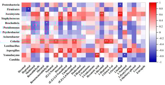 Heat map of correlation analysis between dominant microorganisms and key flavor compounds. Note: in the correlation heat map, the top three rows show the correlation between dominant phyla and key volatile compounds, and the bottom ten rows show the correlation between dominant genera and key volatile compounds; * significant correlation; ** extremely significant correlation.