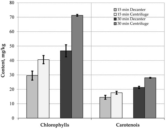 The results for the contents of chlorophylls and carotenoids (Figure 1) show statistically significant differences. On the one hand, there are differences between the oils obtained from malaxing for 15 min and 30 min, and on the other hand, between the oils obtained at the decanter outlet and the vertical centrifuge outlet. In the first case, it is concluded that the content of photosynthetic pigments increases with malaxing time. Espínola et al. [25] and Vidal et al. [26] observed the same behavior working in an interval of 30 min to 90 min and different cultivars. In another study, Vidal et al. [23] obtained the same results working in an interval of 60 min to 120 min at the industrial level under continuous working conditions. In the second case, there is a difference between the oil coming from the vertical centrifuge and the decanter, possibly due to the fact that they are fat-soluble pigments that concentrate when the oils are clearer.