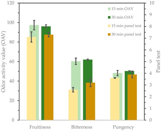 Contribution of each attribute to the sensory profile of oils obtained with different malaxing times of 15 min and 30 min. Comparison of contribution measured by the addition of the odor activity value (OAV) of the volatile compounds that belongs to each attribute group and the sensory attributes perceived from the panel test.