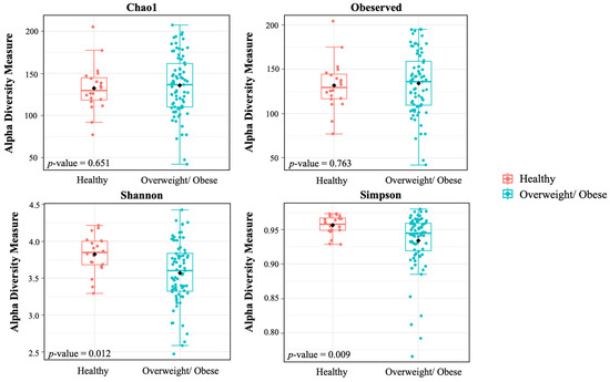Revised Y axis and format of p-value Alpha diversity of the healthy and overweight/obese group. The alpha diversity represented within-sample diversity.