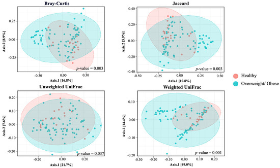 We employed four metrics to analyze alpha diversity: the observed species, ChaoI index, Shannon index, and Simpson index, all of which measure richness and evenness. Our findings revealed significantly lower richness in alpha diversity indices, specifically in the Shannon (p = 0.012) and Simpson indexes (p = 0.009), in the overweight or obese group compared to the healthy group (Figure 1). The PCoA based on non-phylogenetic (Bray–Curtis dissimilarity, Jaccard distance) and phylogenetic methods (UniFrac distance) displayed a distinct separation between the gut microbiota community of the overweight or obese and healthy groups, a result confirmed by the pairwise PERMANOVA analysis. These outcomes demonstrate a significant difference in beta diversity between the two groups (Figure 2) (p = 0.003 for Bray–Curtis, p = 0.003 for Jaccard, p = 0.037 for unweighted UniFrac distance, and p = 0.001 for weighted UniFrac distance).