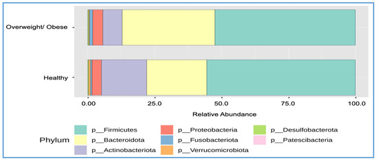 The gut microbiota composition analysis at the phylum level revealed that Firmicutes accounted for 52.5% in overweight or obese individuals and 55.6% in healthy individuals, while Bacteroidetes comprised 34.6% in overweight or obese individuals and 22.4% in healthy individuals (Figure 3 and Table 4). The overweight or obese group exhibited significantly higher levels of Bacteroidetes (34.6% vs. 22.4% in the healthy group) and significantly lower levels of Actinobacteriota (7.3% vs. 17.0% in the healthy group). No significant differences were observed in the relative abundance of Firmicutes, Proteobacteria, Verrucomicrobiota, Fusobacteriota, or Desulfobacterota between the two groups. The Firmicutes to Bacteroidetes (F/B) ratio was 1.96 in the overweight or obese group and 2.80 in the healthy group, with a statistically significant difference (p = 0.035).