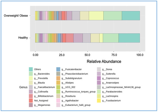 The reasons behind changes in the complex gastrointestinal microbiome ecosystem due to obesity remain controversial. LEfSe analysis revealed that the more prevalent genera in the overweight or obese group were Lachnoclostridium, Agathobacter, and Prevotella, while the healthy group had a higher abundance of Bifidobacterium, Collinsella, Subdoligranulum, and Alistipes (Figure 4). A cross-sectional study in Emirati participants identified differences in taxa using LEfSe, with the obese group showing three key genera: two from Firmicutes (Lachnospira and Acidaminococcus) and one from Verrucomicrobia (Akkermansia) [9]. It is more likely that differences at the microbiota’s genus level between the overweight or obese and healthy groups were observed in our results, including high abundances in the healthy group of Lactobacillus, Faecalibacterium, Coprobacillus, etc. (Table 5). Interestingly, previous studies revealed both elevated and reduced levels of Lactobacillus related to obesity [29,30].