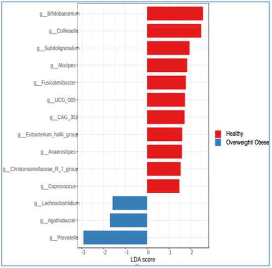 The results of the Linear Discriminant Analysis Effect Size (LEfSe) revealed distinct microbial profiles between the groups: 13 genera in the healthy group vs. 3 in the overweight or obese group (Figure 4). Notably, the LDA scores (log10) greater than two for the overweight or obese group included Prevotella, Lachnoclostridium, and Agathobacter. In contrast, the healthy group had higher LDA scores for Bifidobacterium, Collinsella, and others.
