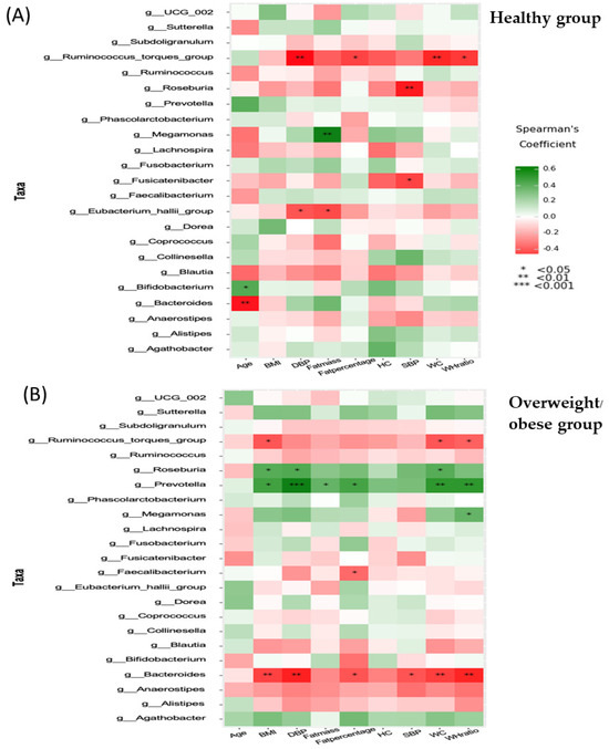 Correlation between age, blood pressure, and anthropometry and microbiota in the healthy group (A) and the overweight/obese group (B).