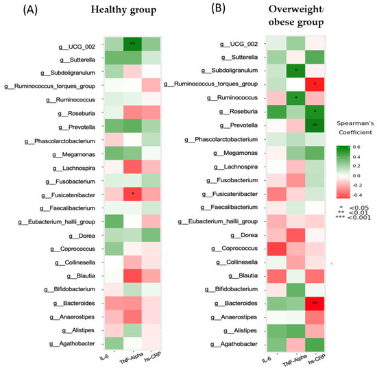 Correlation between inflammatory markers and microbiota in the healthy group (A) and the overweight/obese group (B).