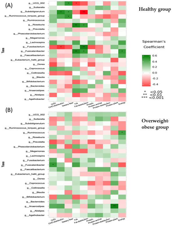 Correlation between dietary intake and microbiota in the healthy group (A) and the overweight/obese group (B).