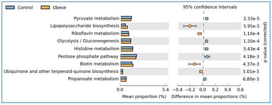 Our study involved a comprehensive exploration of the metabolic pathways within the gut microbiota, aiming to understand their association with the metabolic disparities observed in the healthy and overweight groups. This was accomplished through a rigorous comparative prediction analysis of the functional metagenome (PICRUSt) of the gut bacterial microbiota (Figure 9). The analysis led to the identification of nine metabolic pathways in which the difference in the percentage of relative frequency was statistically significant among the two groups (all p ≤ 0.01). In the healthy group, pathways such as pyruvate metabolism, glycolysis or gluconeogenesis, histidine metabolism, the pentose phosphate pathway, and propanoate metabolism (CHO metabolism) were enriched. Conversely, the overweight or obese group showed enriched levels of LPS biosynthesis, riboflavin metabolism, biotin metabolism, and ubiquinone and other terpenoid-quinone biosynthesis.